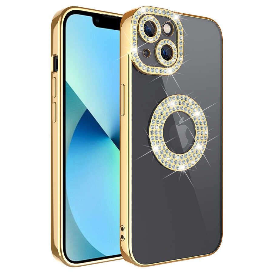 Apple iPhone 13 Kılıf Kamera Korumalı Taş Süslemeli Arkası Şeffaf Zore Asya Kapak Gold
