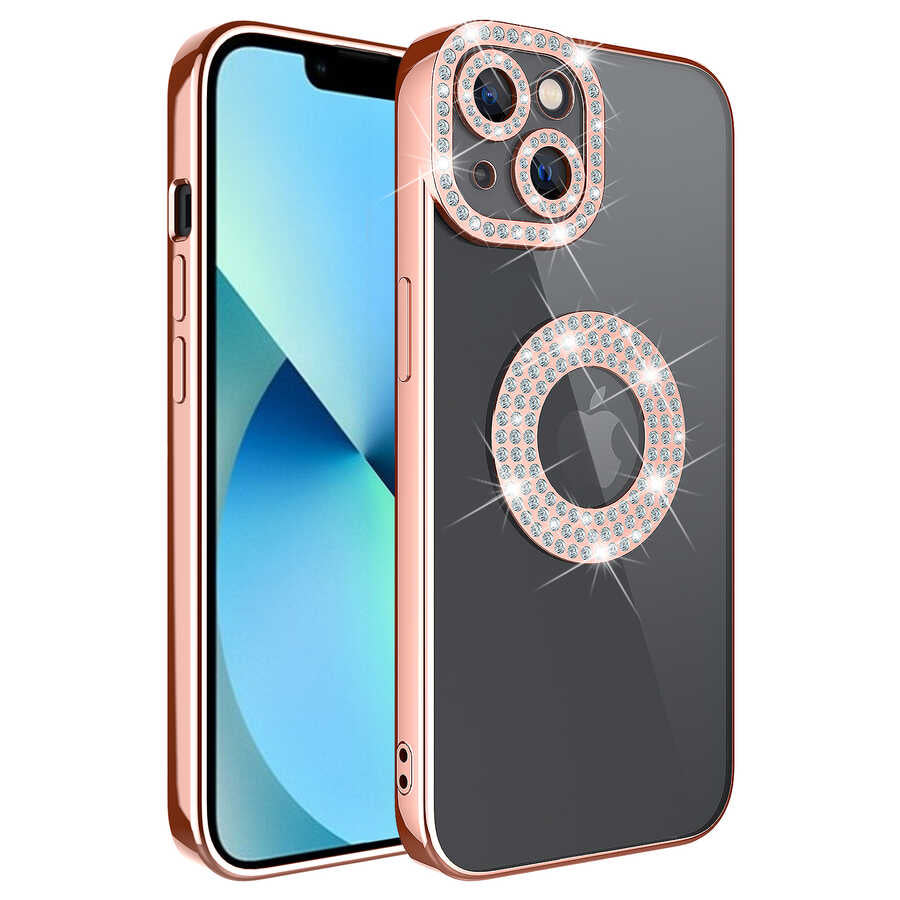 Apple iPhone 13 Kılıf Kamera Korumalı Taş Süslemeli Arkası Şeffaf Zore Asya Kapak Rose Gold
