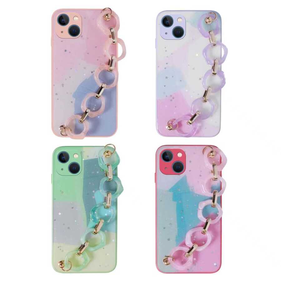 Apple iPhone 13 Kılıf Simli Desenli El Askılı Tutacaklı Zore Elsa Silikon Kapak Pembe Koyu