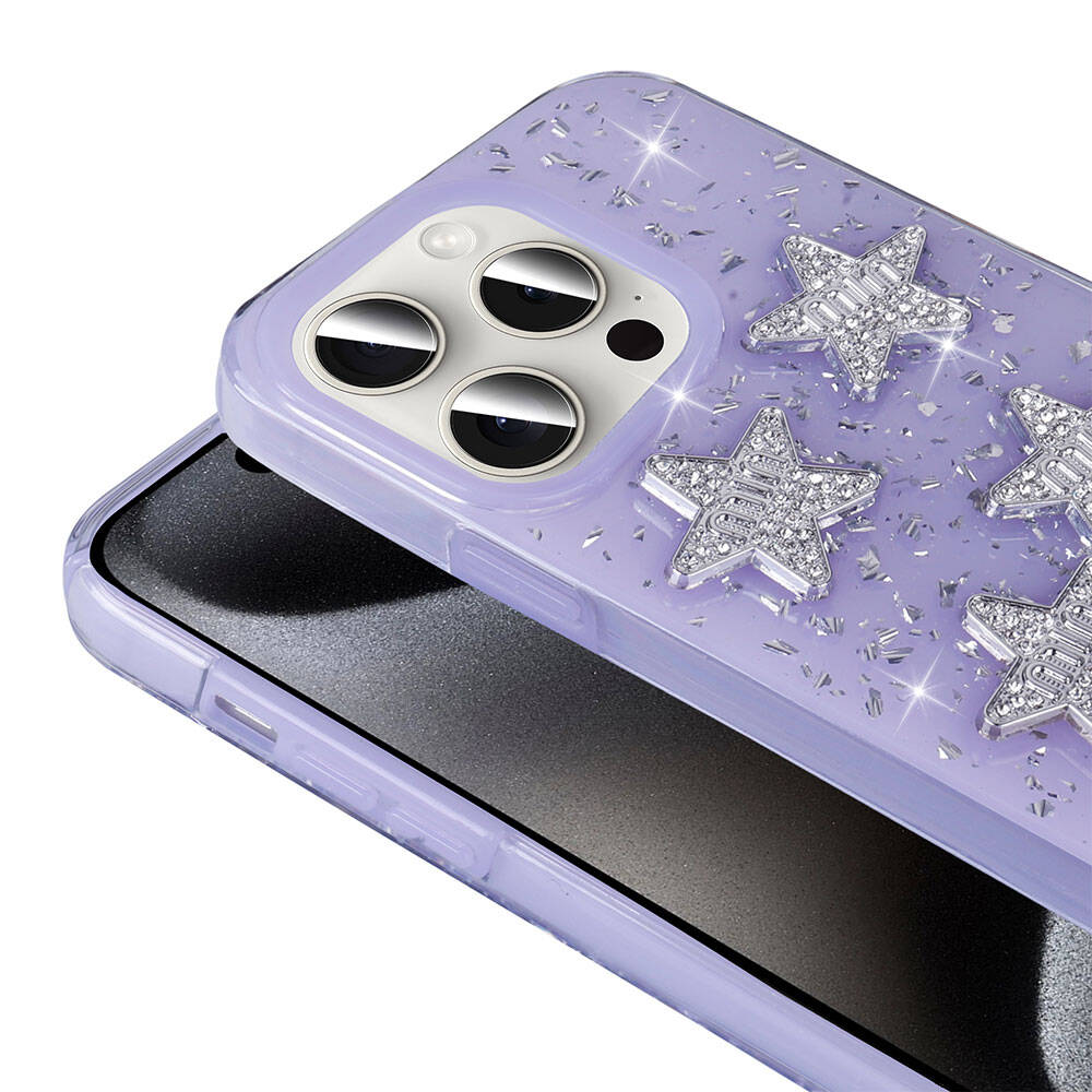 Kalp, yıldız ve fiyonk şekilleriyle birlikte simli tasarım, parıltılı şık arka yüzey yapısı.