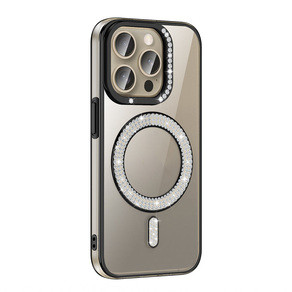 Apple iPhone 15 Pro Kılıf Pırlanta Taş Tasarımlı M-safe Şarj Özellikli Zore Karetta Silikon Kapak Siyah