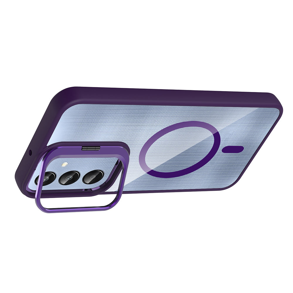 Galaxy A25 Kılıf Standlı ve Kamera Lens Hediyeli M-Safe Şarj Özellikli Zore Etro Kapak Derin Mor
