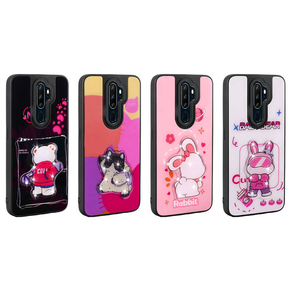 Oppo A9 2020 Kılıf Parlayan Kabartmalı İkonik Figürlü Zore Amas Silikon Kapak Mor